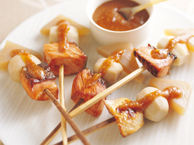 - 5とを竹ぐしに刺し、器に盛る。をつけて食べる。
