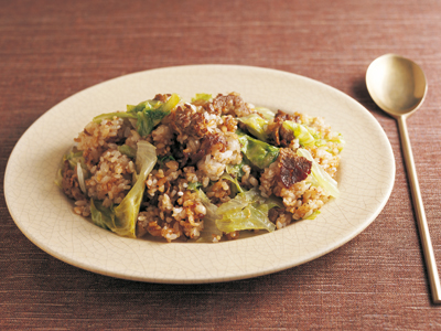 - 3中華鍋またはフライパンにサラダ油少々を熱して牛肉を入れ、強火でいためる。肉に八分ぶどおり火が通ったら雑穀ご飯を加え、パラパラになるまでいためる。