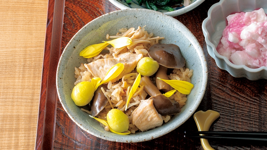 - 41に【B】を加えて混ぜ、3の具を全体に広げるようにのせ、普通に炊く。炊き上がったらサックリと混ぜて器に盛る。菊の花はガクから花びらを外し(全体備考1.参照)、ぎんなんとともに散らす。