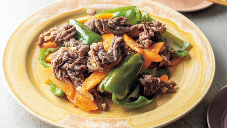 - 1にんじんは縦半分に切り、3mm厚さの斜め薄切りにする。ピーマンは四つ割り(小さければ縦半分)にしてヘタと種を除く。にんにくは薄切りにする。牛肉は大きければ食べやすい大きさに切る。 ! ポイント ふたをして8分間で火が通るサイズはこれくらい!