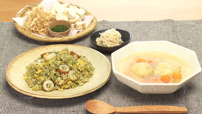 - チャーハンに使うごはんは、温かいほうがほぐれやすいです。青のり粉を加えて香り良く仕上げましょう