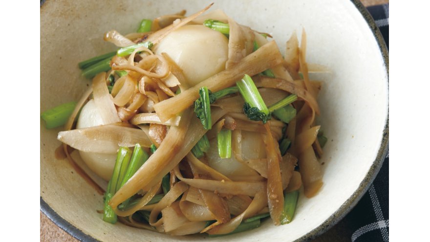 - 1ごぼうはたわしでこすってよく洗い、ピーラーで6~7cm長さに薄く削って水に入れる。小さくなったら包丁で薄く切る。全部切ったら大きく混ぜ、ざるに上げて水けをよくきる。かぶは縦半分、または4等分に切る。かぶの葉は2cm長さに切る。