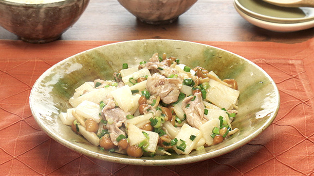 - みそ汁やあえものに使うことが多いなめこを炒めもので味わいます。長芋との食感の違いを楽しんで
