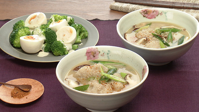 れんこん鶏だんご汁 kyou 16時間前 材料 (2人分) れんこん150g 鶏ひき肉(もも)100g 小麦粉大さじ2 塩小さじ1/4 生椎茸2枚(30g) 青ねぎ1~2本(50g) だし汁3カップ みそ大さじ2~3 作り方 ポイント れんこんは皮ごとすりおろすと無駄がなく、香りもよくなります すりおろしたれんこんから出た余分な汁気はだし汁に加え、やさしいとろみをつけましょう れんこんを加えることで、もちっとした食感の鶏だんごになります。ぜひお試しください!