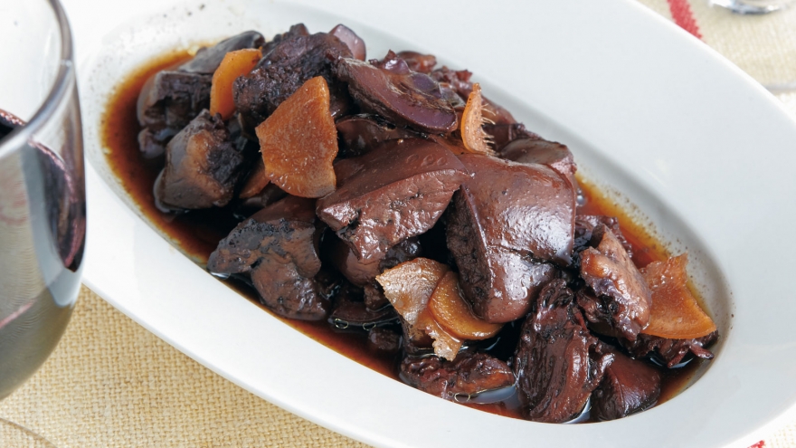 - 3鍋に【A】、しょうがを入れて中火にかける。煮汁が温まったらレバーを加え、弱めの中火で約15分間煮る。火を止め、煮汁につけたまま冷ます。