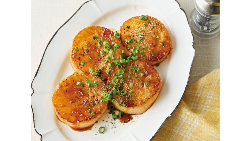 - 3【A】は混ぜておく。フライパンにごま油大さじ1を中火で熱し、2の大根を切り目を入れた面を上にして並べ入れる。焼き色がついたら返し、両面をこんがりと焼く。火を止め、混ぜた【A】を回し入れ、余熱で温めながら大根にからめる。器に盛り、黒こしょう少々、細ねぎをふる。