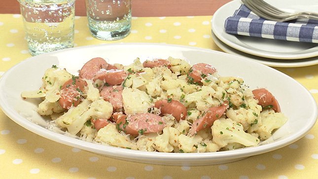 カリフラワーとソーセージのレモンマスタード炒め kyou 12時間前 材料 (2人分) カリフラワー1個(460g) 粗びきソーセージ6本(120g) あらびきマスタード、レモン汁各小さじ2 塩小さじ1/4 こしょう少々 パセリのみじん切り大さじ2 パルメザンチーズ(おろす)適量 ●オリーブ油 作り方 ポイント カリフラワーはさっと炒めてから水を加え、蒸し炒めにすることで甘みを引き出すのがポイント カリフラワーは生でも食べられるので、少し食感が残るくらいに炒めましょう カリフラワーの茎はやわらかいので、皮をむかずに調理OK。茎も葉も捨てずに活用してください!